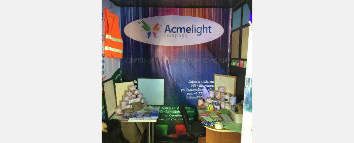 ТОО «Арт Строй Спецкомплект» представила следующие продукты Фабрики по производству светящихся материалов Acmelight: люминесцентная краска Acmelight FES, которая применяется для разметки маршрутов аварийной эвакуации людей; Acmelight Road – светящаяся краска для разметки автомобильных дорог; схемы плана эвакуации на светящейся фотобумаге; знаки безопасности на пленке FES.
