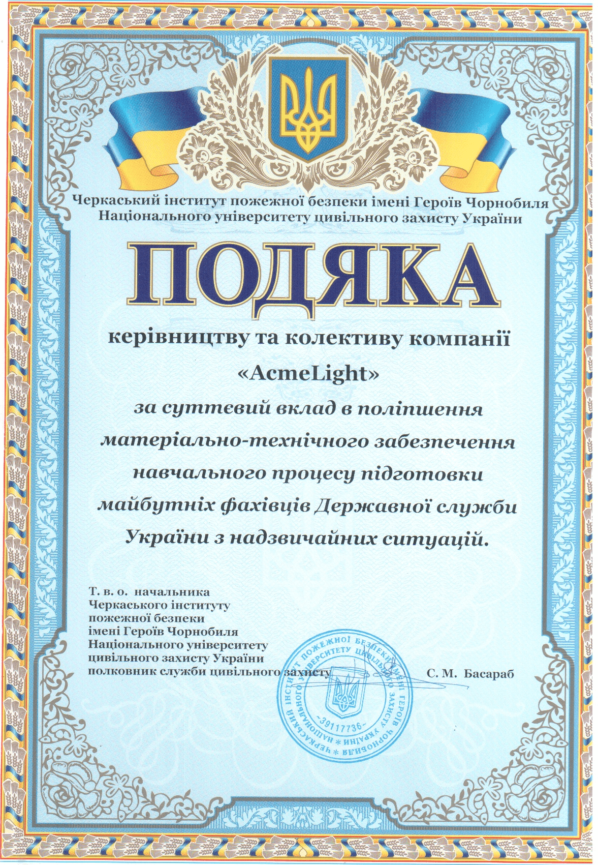 Не жди благодарности, а просто делай добрые дела – вот так можно охарактеризовать политику связей с общественностью Фабрики по производству светящихся продуктов Acmelight. И, конечно, когда к руководству компании обратился доцент кафедры ППР Черкасского института пожарной безопасности им. Героев Чернобыля капитан службы гражданской защиты Мельник Руслан Павлович с просьбой помочь оборудовать демонстрационные стенды по системам FES, были высланы светящиеся материалы. Среди них – светящаяся краска, планы эвакуации, знаки безопасности.
