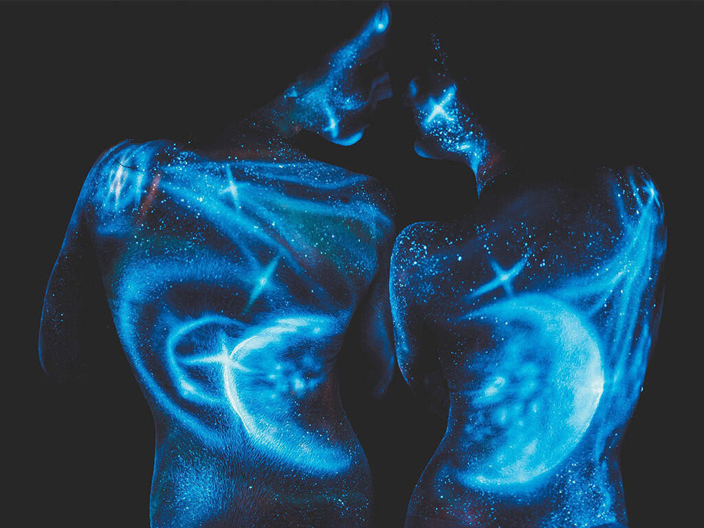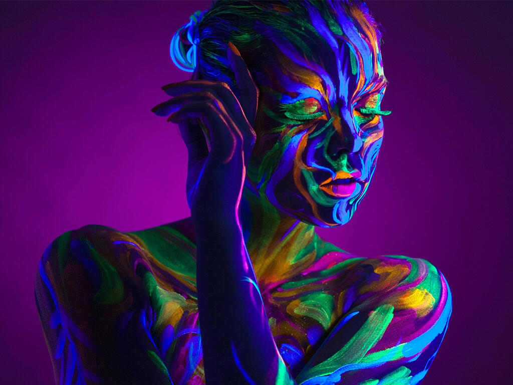Нанесение краски: Наносить флуоресцентную краску на поверхность тела удобнее всего спонжами и кисточками из натуральных материалов. Перед основным нанесением рекомендуется сделать тест на отсутствие аллергической реакции. Для этого необходимо насести небольшое количество краски на внутренний сгиб локтя. Отсутствие покраснения в течение 30 минут говорит о возможности применения краски на всем теле. Перед нанесением аквагрима кожу необходимо слегка увлажнить специальными составами для кожи. Краску наносят через трафарет или предварительно прорисовывая контур желаемого рисунка. Смывается флуоресцентная краска теплой водой с мылом, далее для полного очищения пор необходимо воспользоваться специальным скрабом для лица и тела или кремом для снятия макияжа.
